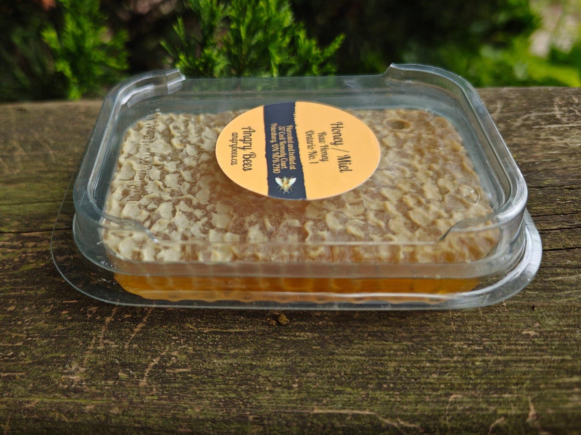 Cut comb which is cut to fit into a box and weighs around 400g. Half comb which is built by the bees directly into the container itself, the only thing we do is put a lid on it, half comb weighs around 100g.